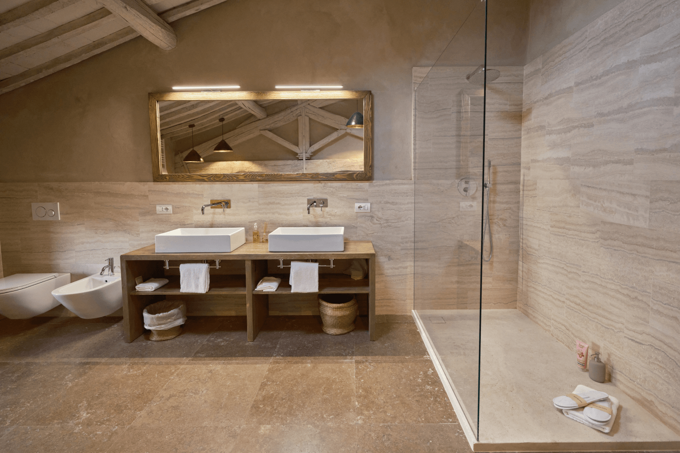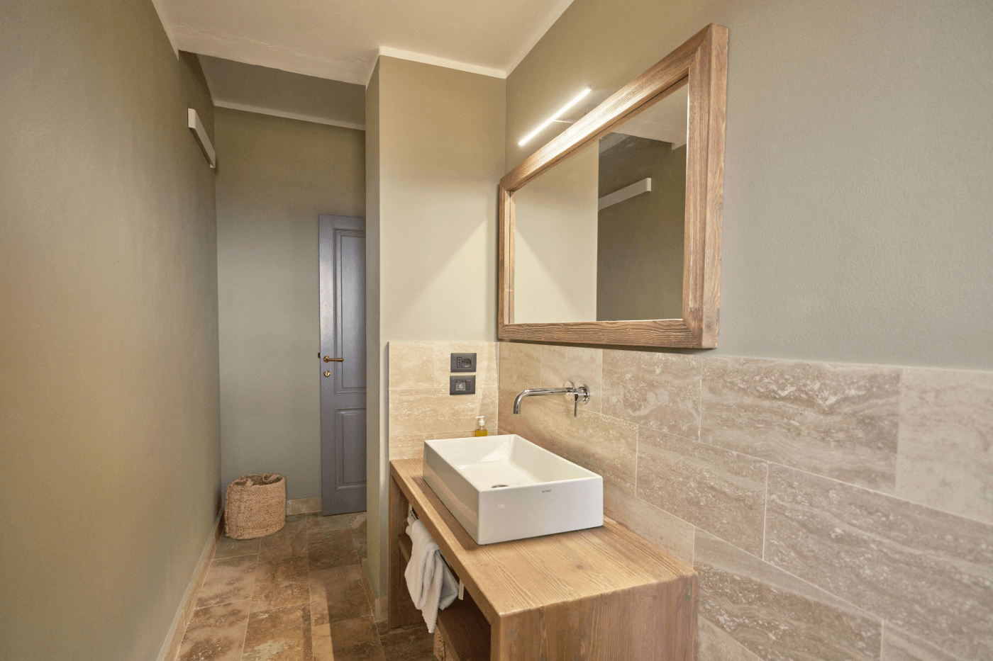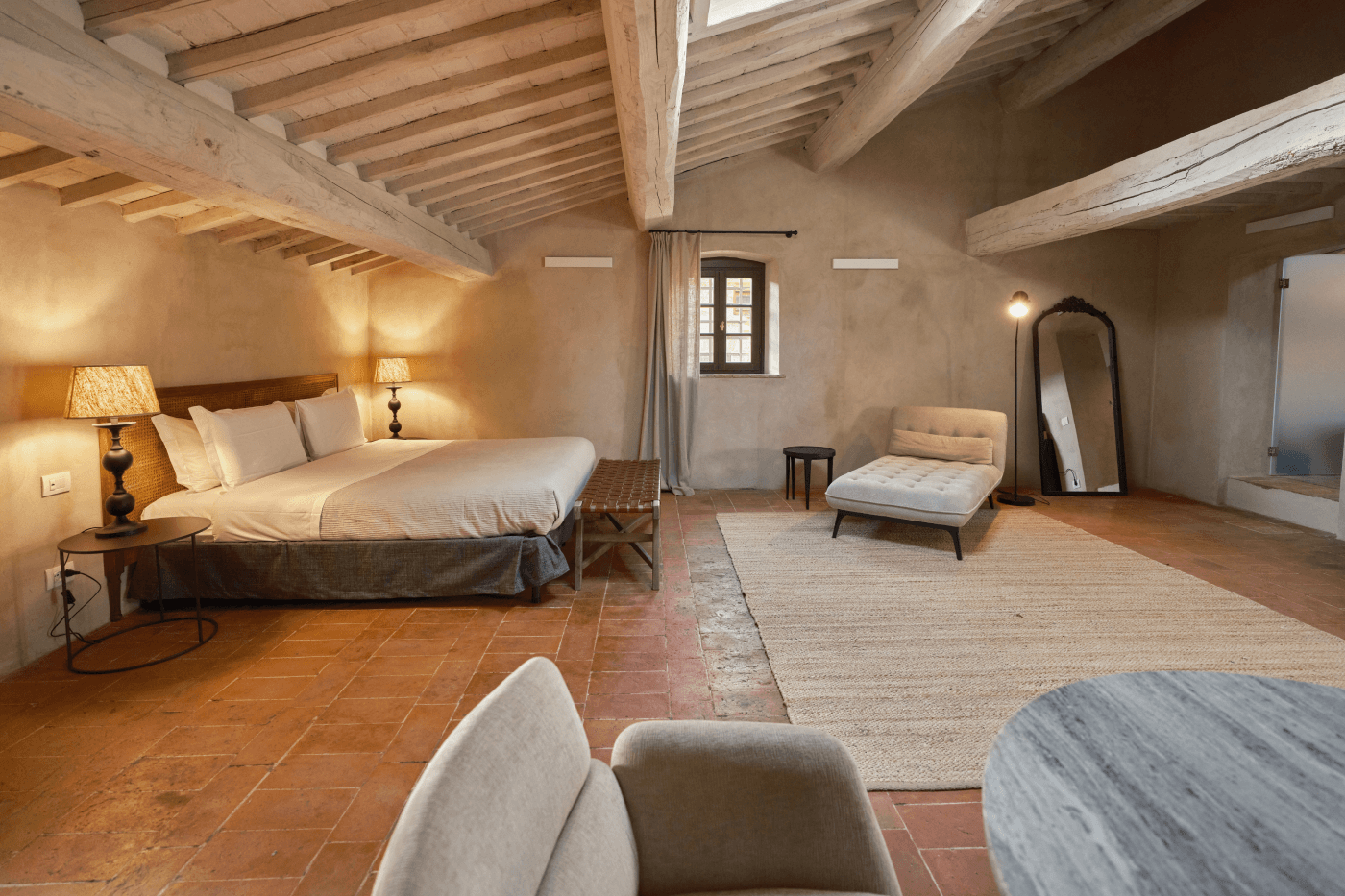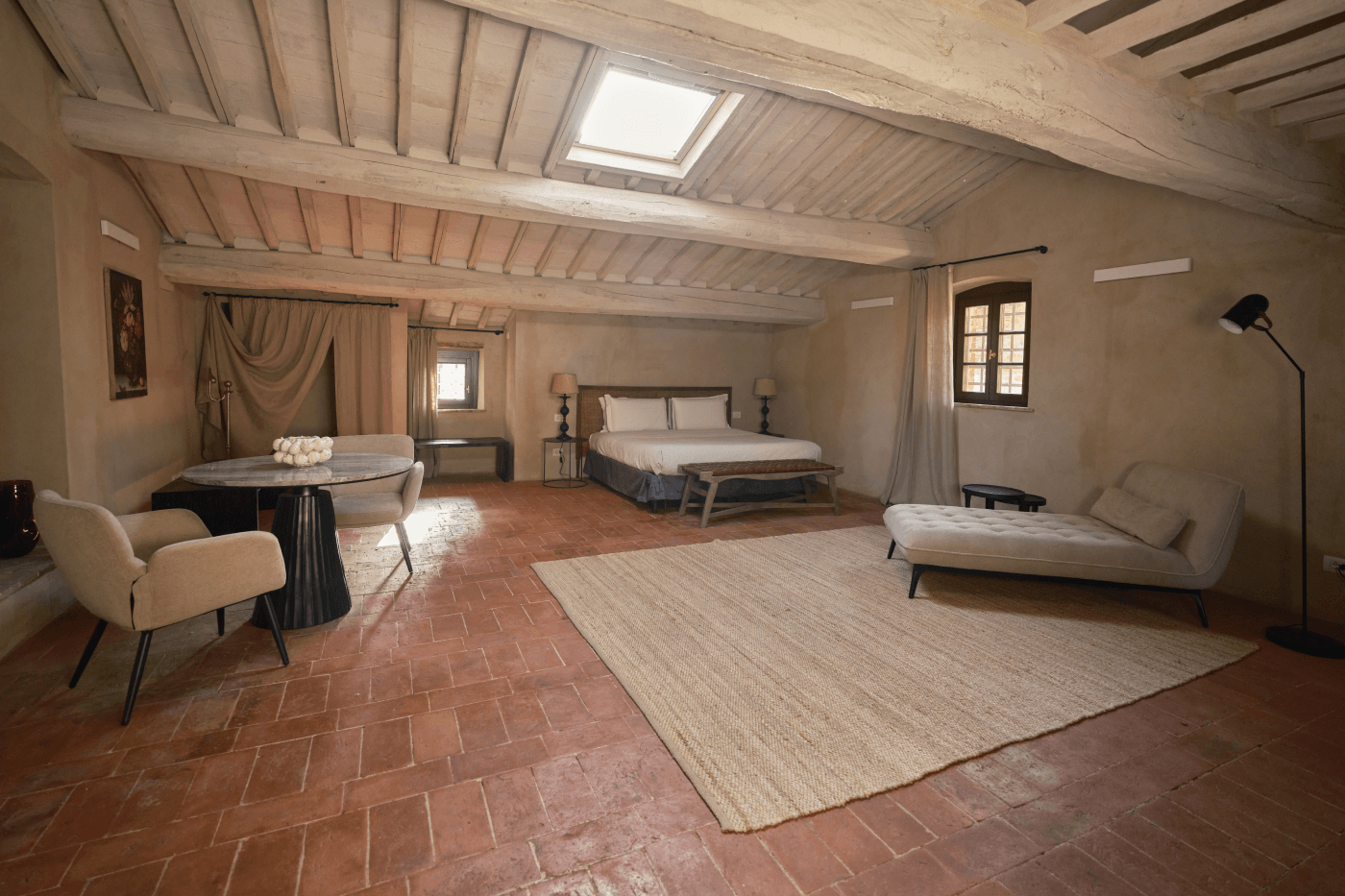 Each room is designed to embrace the soul of the Palazzo and its surroundings. Meticulously refurbished with noble materials from the region, they reflect a refined yet natural aesthetic. Travertine stone, rich wood, and soft natural fabrics come together to create an atmosphere of warmth and timeless beauty. Every detail, from the handcrafted furnishings to the soft play of light filtering through historic windows, invites you to slow down, breathe, and savor the magic of Tuscany.