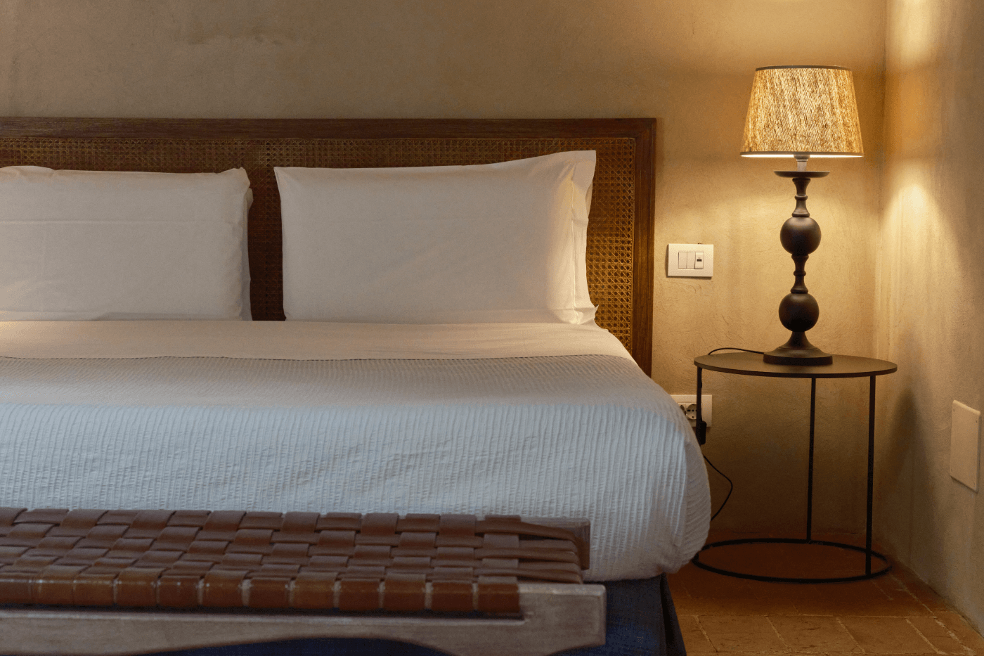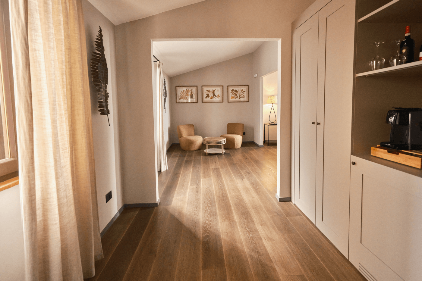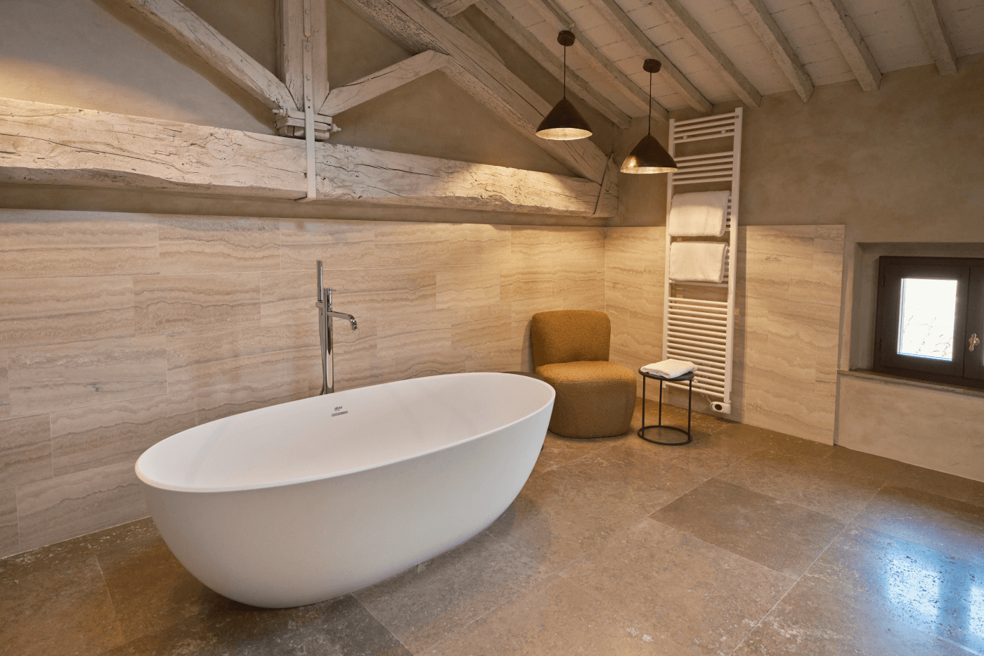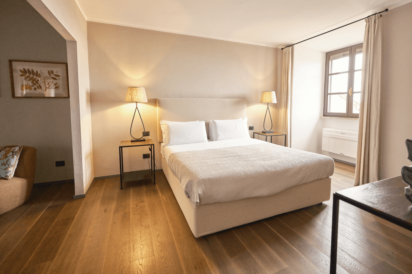 Each room is designed to embrace the soul of the Palazzo and its surroundings. Meticulously refurbished with noble materials from the region, they reflect a refined yet natural aesthetic. Travertine stone, rich wood, and soft natural fabrics come together to create an atmosphere of warmth and timeless beauty. Every detail, from the handcrafted furnishings to the soft play of light filtering through historic windows, invites you to slow down, breathe, and savor the magic of Tuscany.